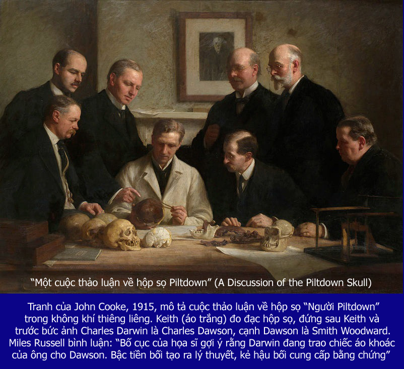 Chao ôi, chuyện lớn rồi. Hóa ra một số nhà khoa học nghiêm túc và rất đáng kính đã bị đánh lừa! Thanh danh của họ mãi mãi bị nhơ nhuốc. Những năm tháng nghiên cứu và suy nghĩ cực nhọc đã bị phí phạm vào việc cố gắng phân tích và lắp ghép một hóa thạch giả sao cho ăn khớp với hồ sơ tiến hóa của loài người. Niềm tin sắt đá vào một học thuyết “thần thánh” đã bị TRẢ GIÁ ĐẮT! Những nhà khoa học ấy là ai? Chúng ta có thể biết rõ, đó là những người có mặt trong bức tranh sau đây: