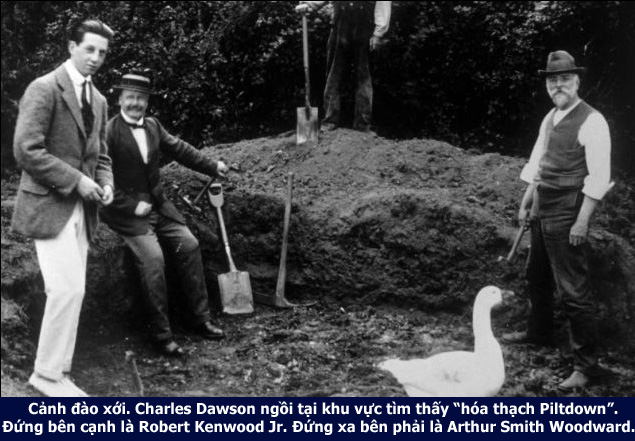 – Pierre Teilhard de Chardin, một nhà triết học tôn giáo ủng hộ thuyết tiến hóa, trực tiếp giúp Dawson đào xới tìm di vật ở Piltdown;